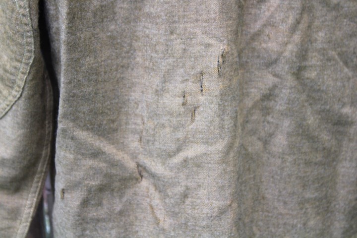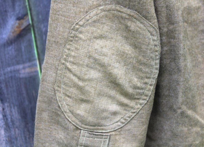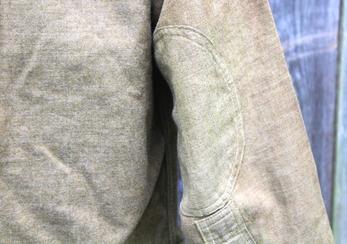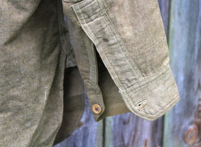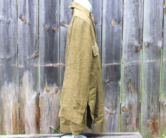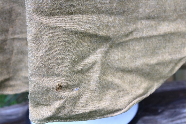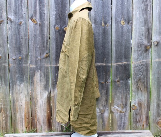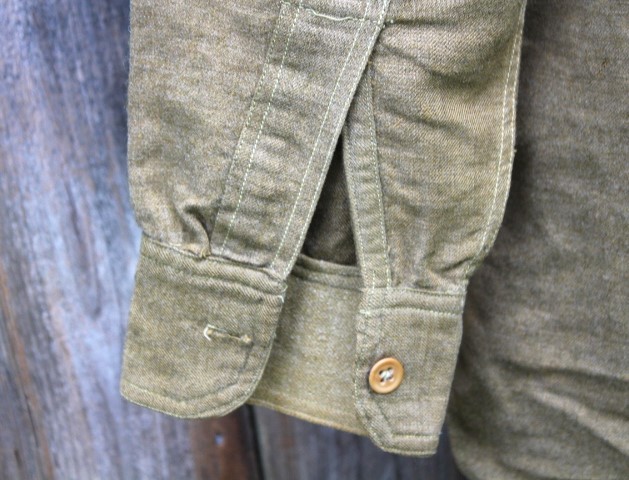 This is a US Army Model 1916 wool pullover shirt used during the Mexican Expedition, World War I and into the 1930's. These are the standard shirts worn by all Army personnel during the war. It is made of 8 1/2 ounce olive drab colored shirting flannel that is 80% wool and 20% cotton. It is a pullover style shirt with a three button placket front. It has a rolling collar. Six of the seven brown plastic buttons are still present. The one missing is for the right pocket flap. There are two pockets on the front of the shirt, each straight pocket flap secured by a single button. On each pocket is a sewn pencil pocket, located on the button side of the pocket. Each sleeve has been reinforced with an oval shaped elbow patch. The sleeve openings have been reinforced with white cotton bating. The quartermaster tag is missing from this shirt, just the stitching remains. The shirt is in very good condition, but does have several small slits on the back. mostly down by the hem line. It is a medium size shirt, but does not have any size stamped on it. This shirt would look great on a mannequin and compliment any WWI Doughboy collection.