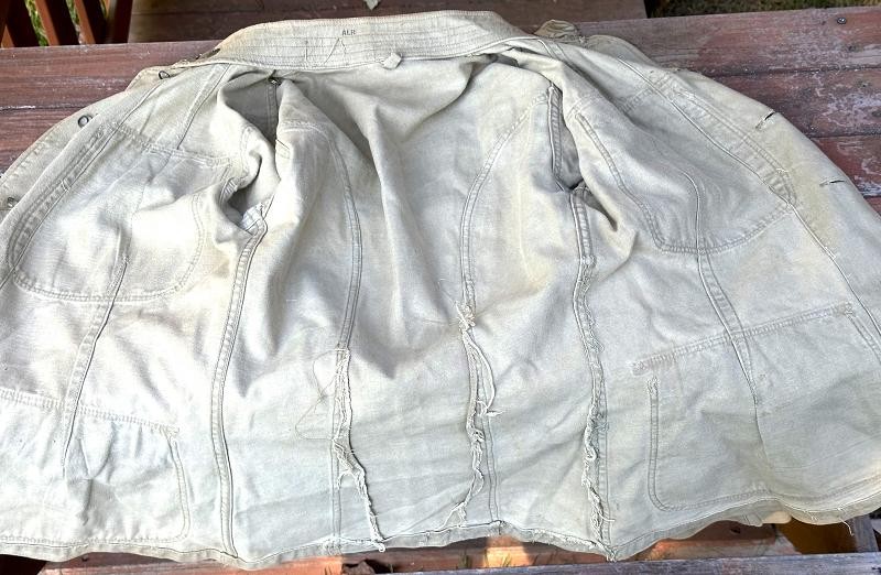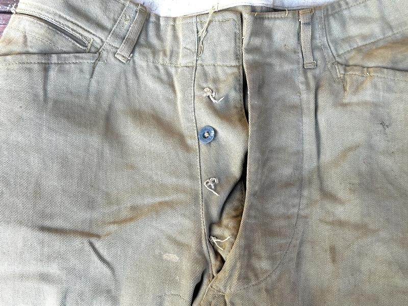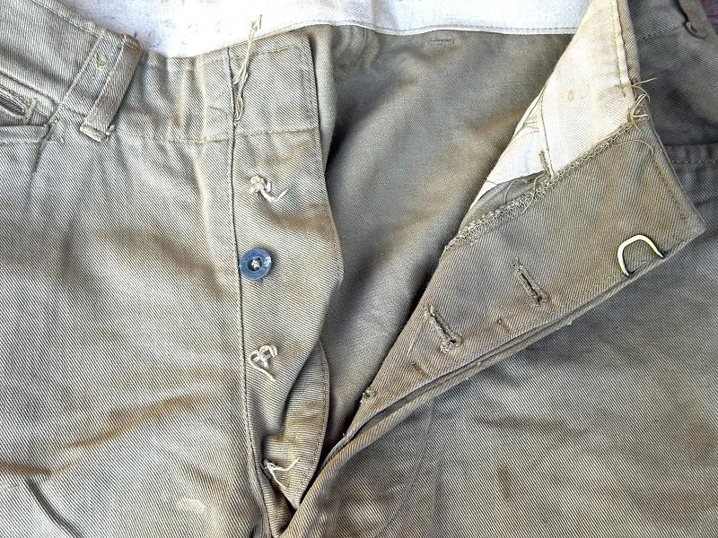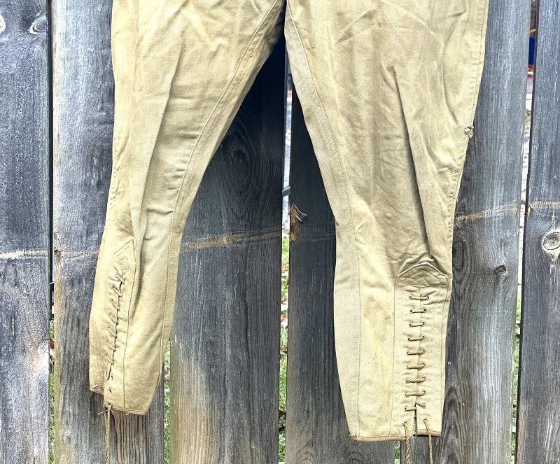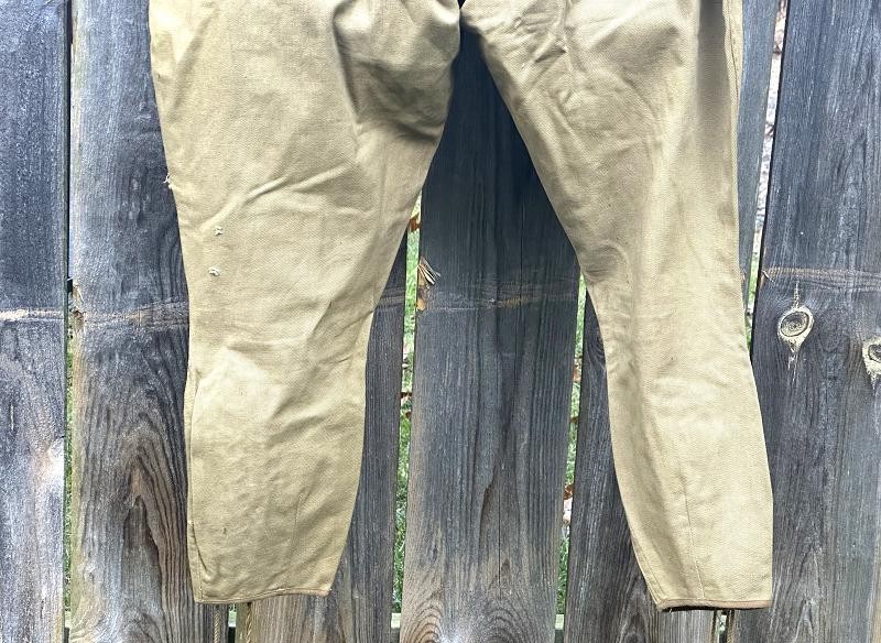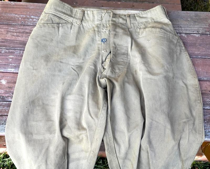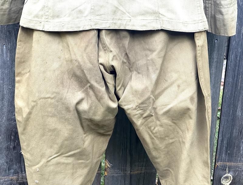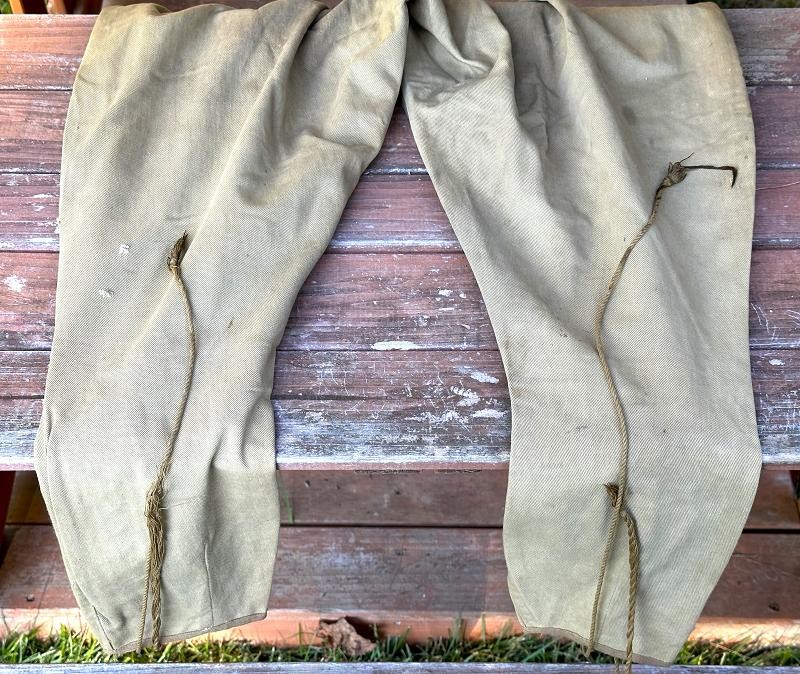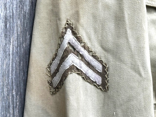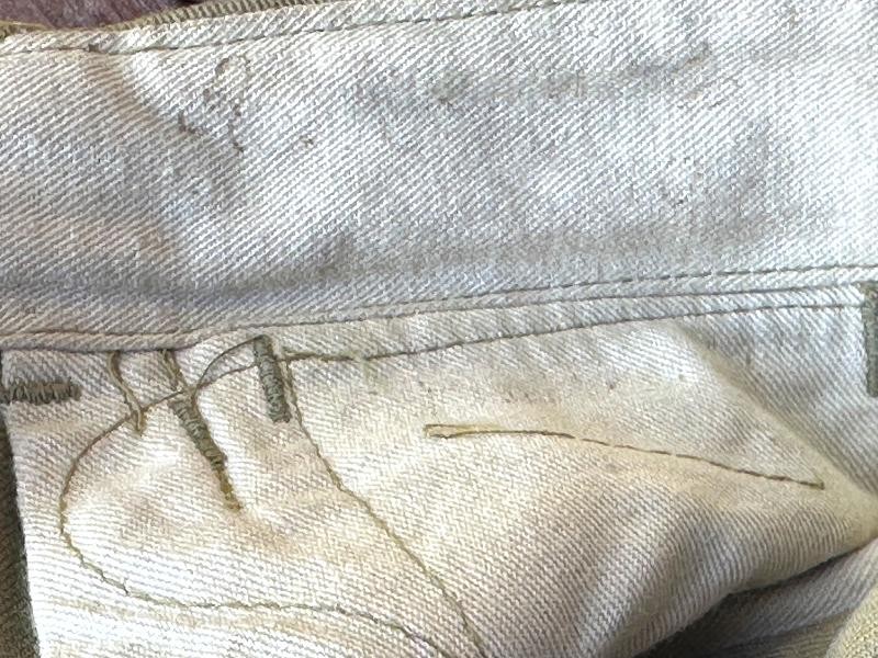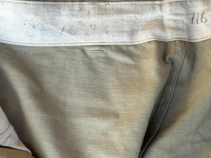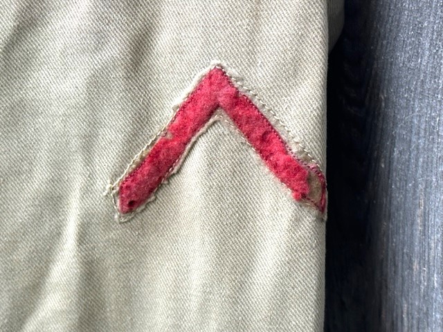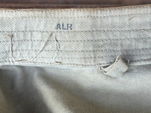 This is a Model 1910 uniform consisting of the tunic and pants. The summer version of this uniform is a little more difficult to find, as it is made of cotton twill fabric instead of the more common wool fabric. The jacket, or tunic, is unlined and is of a single breast design. There are five subdued bronze general service buttons on the front, along with six smaller general service buttons. The jacket has a standing collar, shoulder epaulettes, plain cuffs and four pockets on the front. Each epaulet has a small general service button, as does each pocket to secure the flap. The collar has two one inch disks, one US with the number 12 below it and the other the branch insignia of the Artillery with the number 1 below it. The left sleeve has the patch of the 1st Battalion, 12th Field Artillery Regiment, 2nd Infantry Division, a red discharge stripe and three bullion overseas chevrons. The left sleeve has the chevrons of a Corporal on it. The 2nd Division was part of the Allied Expeditionary Force that fought in World War I. It is the only Army unit with the distinction of being formed overseas, being organized in France on 26 October, 1917 at Bourmont, Haute Marne. The 2nd Division was awarded the French Croix de guerre on three separate occasions. They fought the Third Battle of the Aisne, Belleau Wood, the Chateau Thierry Campaign, St. Mihiel, the Meuse-Argonne Offensive and the Aisne-Marne Offensive. The division suffered 1964 soldiers and 4478 Marines killed in action, along with 9782 soldiers and 17,752 Marines wounded. The jacket has the initials ALR ink stamped in the collar. The pants have the soldier first two initial of A L and his last name R??LE in two places on the waist band. It is also marked C 12 FA below his name. There is some research to be done for someone who has a little more time to spend on it than me! The jacket and pants are in very good condition. There is a small hole along the left seam of the pants about knee height, and two smaller ones on the back side of the same area. The crotch is missing three of the four buttons and the fabric loop for the hoop to secure the pants is pretty tired. The strings are still present in the pants legs. Hopefully I will have more information to add about the soldier soon!
