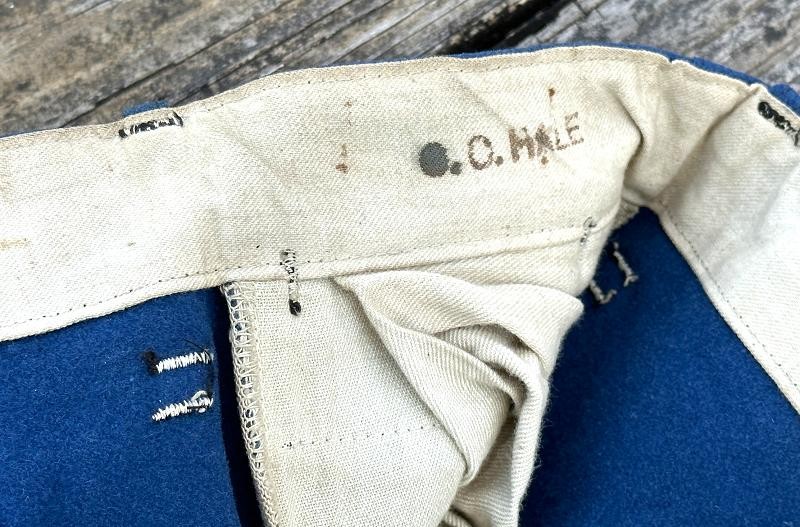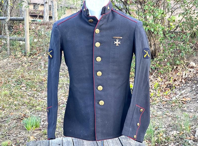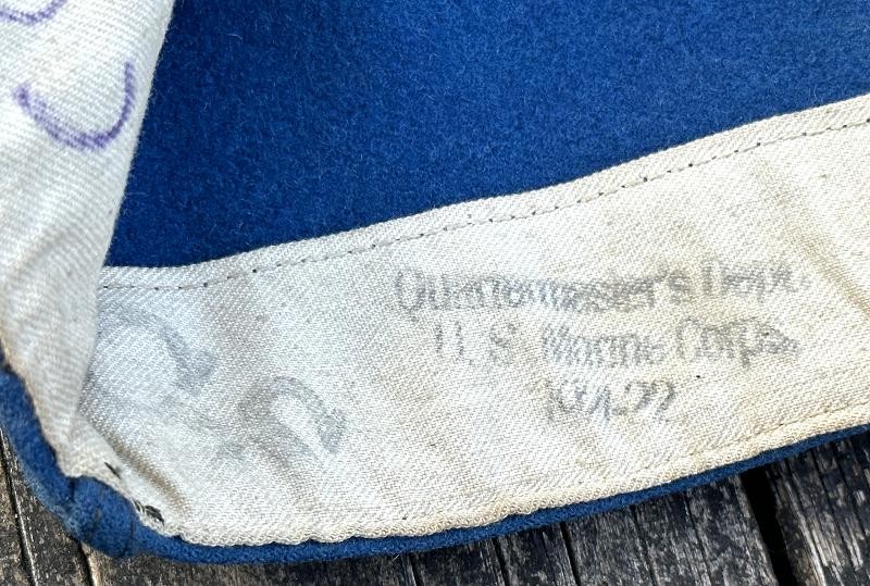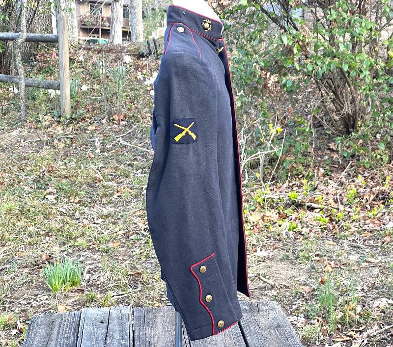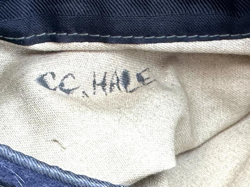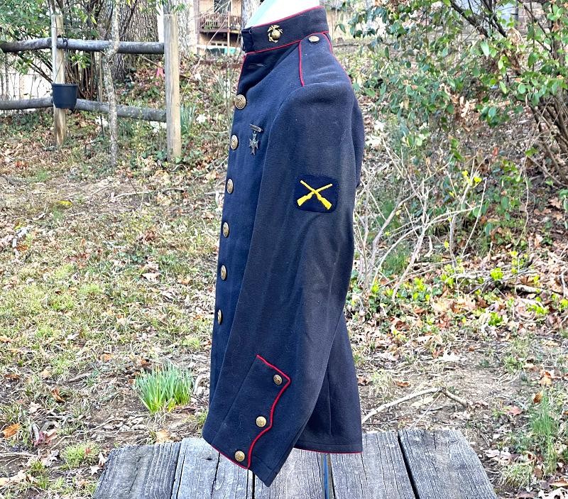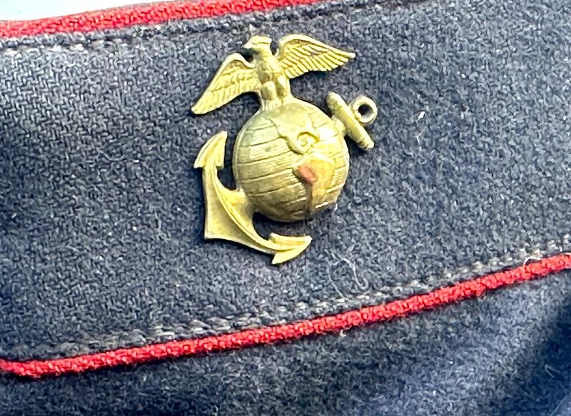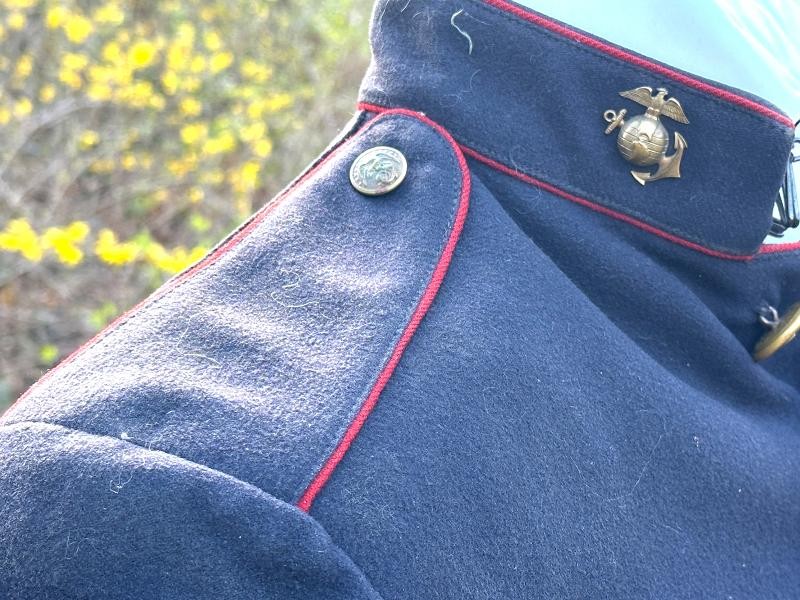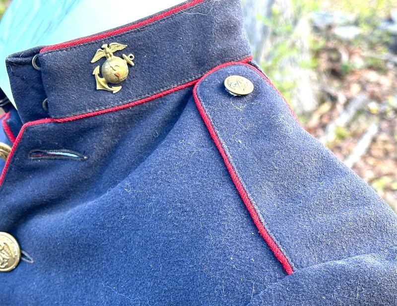 This is a set of United States Marine Corps dress blues from the early 1920's identified to Private First Class Charles C. Hale. Like all Marine dress blues prior to 1947, there are no external pockets. It has the false epaulets on the shoulders. The seven button coat has the gold USMC eagle, anchor and 13 star buttons, with eight smaller buttons of the same type for the cuffs and epaulets. The coat size buttons are all back marked N.S. MEYER NEW YORK. The smaller buttons are all very securely attached and I can't see the back marks. The coat is fully lined and has two inner pockets, one on each side. The sleeve linings have been removed, a common practice with Marines stationed in hotter climates. Unfortunately this makes it difficult to date the jacket, as the Marine Corps Quartermaster stamp and date are located in the left sleeve lining. The initials of the marine's first and middle name followed by his last name are normally found in the right sleeve lining. Fortunately, printed in ink on the inside of the right inner pocket is CC. HALE. Each sleeve has a set of gold crossed rifles sewn onto a blue wool background. This indicated the rank of Private First Class, an insignia used by the Marine Corps from 1917 to 1922. The collar is adorned with a set of 1920's eagle, globe and anchor insignia. There is a Marine Corps Sharpshooter qualification badge pinned on the left breast of the jacket. There is no damage on the jacket, but it could use a good cleaning! The trousers are in excellent condition, no stains, rips tears or repairs and no moth holes. Written in ink on the left side of the waist band is C C HALE, along with the ink stamped Quartermaster's Dept. U. S. Marine Corps and dated 1921-22. C. C. HALE is also ink stamped into the right waist band of the trousers. Charles C. Hale is shown on the first Marine Corps muster roll in June, 1917 as a Private at Recruit Depot, Marine Barracks, Navy yard, Norfolk, Virginia. In July, 1917 he is shown in Company D, Recruit Depot in Norfolk, Virginia. From there is is assigned to 75th Company, 1st Battalion, 6th Marine Regiment at the Marine barracks in Quantico, Virginia. In August, 1917 he was attached to 77th Company, 1st Machine Gun Battalion, Marine barracks, Quantico, Virginia. November, 1917 shows him assigned to Headquarters Detachment, 1st Machine Gun Battalion. In January, 1918 he is attached to 77th Company, 6th Machine Gun Battalion, Marine Corps AEF. In April, 1918 he is shown in the 23rd Company, 6th Machine Gun Battalion. In June, 1918 he is back in 77th Company, 6th Machine Gun Battalion. Charles C. Hale continues to show up in Marine muster rolls until 1926. While researching this marine I did find there was another C C Hale in the 6th Machine Gun Battalion, but he was killed in July, 1918. The 77th Company of the 6th Machine Gun Battalion supported the 3rd Battalion, 5th Marine Regiment during their time in the AEF. This set of dress blues remains in very good condition, and will make a nice addition to any WWI collection.