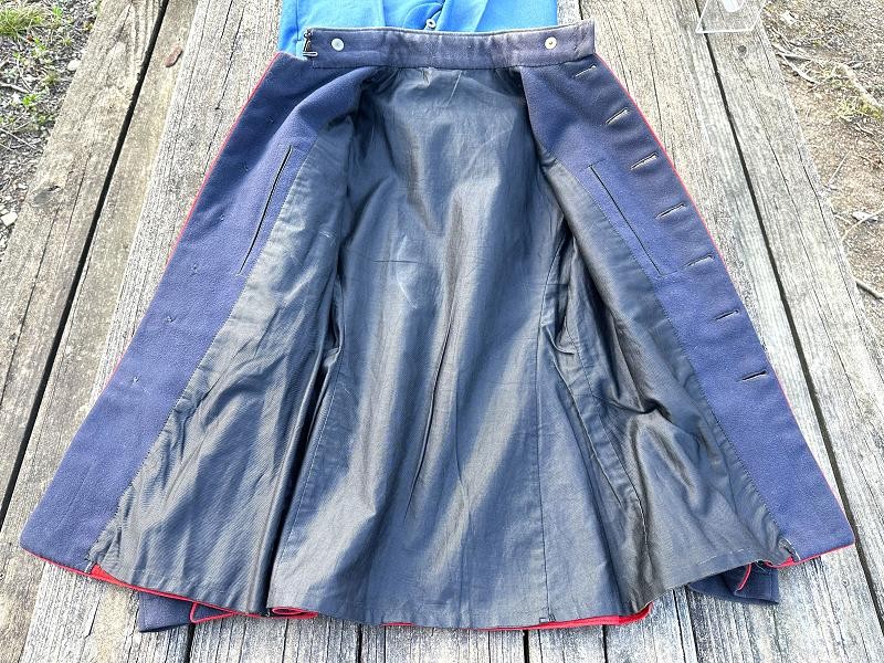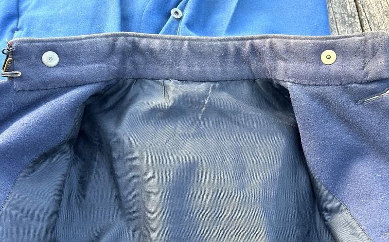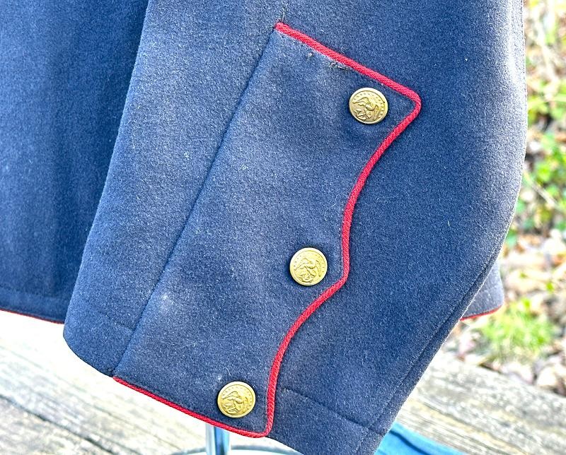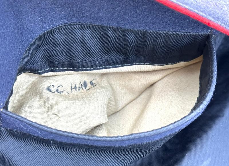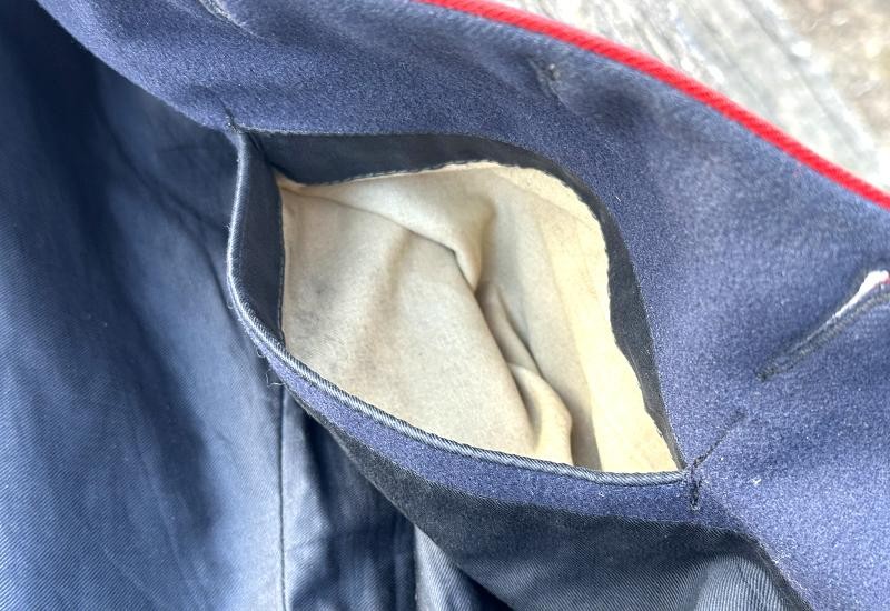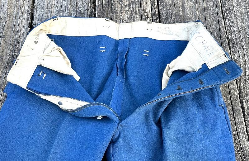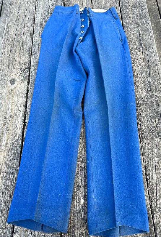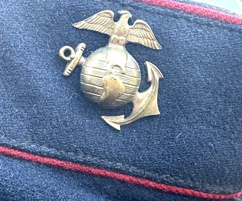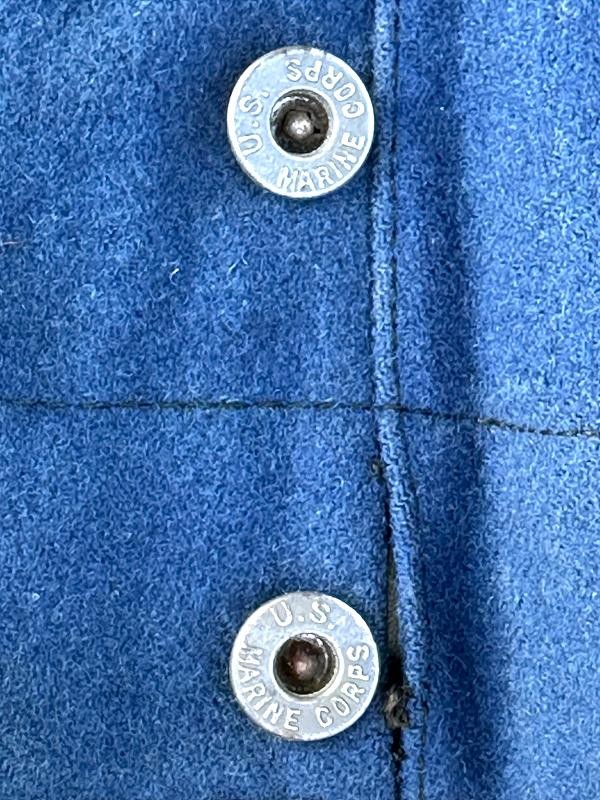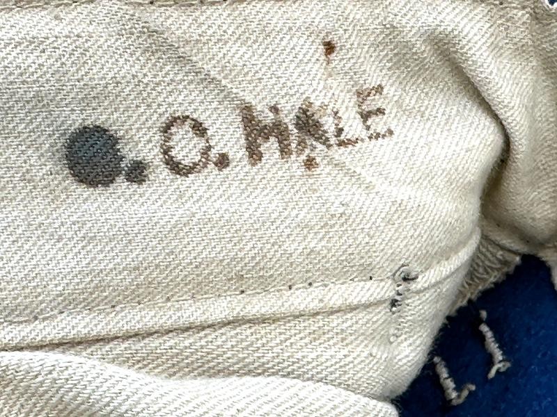 This is a set of United States Marine Corps dress blues from the early 1920's identified to Private First Class Charles C. Hale. Like all Marine dress blues prior to 1947, there are no external pockets. It has the false epaulets on the shoulders. The seven button coat has the gold USMC eagle, anchor and 13 star buttons, with eight smaller buttons of the same type for the cuffs and epaulets. The coat size buttons are all back marked N.S. MEYER NEW YORK. The smaller buttons are all very securely attached and I can't see the back marks. The coat is fully lined and has two inner pockets, one on each side. The sleeve linings have been removed, a common practice with Marines stationed in hotter climates. Unfortunately this makes it difficult to date the jacket, as the Marine Corps Quartermaster stamp and date are located in the left sleeve lining. The initials of the marine's first and middle name followed by his last name are normally found in the right sleeve lining. Fortunately, printed in ink on the inside of the right inner pocket is CC. HALE. Each sleeve has a set of gold crossed rifles sewn onto a blue wool background. This indicated the rank of Private First Class, an insignia used by the Marine Corps from 1917 to 1922. The collar is adorned with a set of 1920's eagle, globe and anchor insignia. There is a Marine Corps Sharpshooter qualification badge pinned on the left breast of the jacket. There is no damage on the jacket, but it could use a good cleaning! The trousers are in excellent condition, no stains, rips tears or repairs and no moth holes. Written in ink on the left side of the waist band is C C HALE, along with the ink stamped Quartermaster's Dept. U. S. Marine Corps and dated 1921-22. C. C. HALE is also ink stamped into the right waist band of the trousers. Charles C. Hale is shown on the first Marine Corps muster roll in June, 1917 as a Private at Recruit Depot, Marine Barracks, Navy yard, Norfolk, Virginia. In July, 1917 he is shown in Company D, Recruit Depot in Norfolk, Virginia. From there is is assigned to 75th Company, 1st Battalion, 6th Marine Regiment at the Marine barracks in Quantico, Virginia. In August, 1917 he was attached to 77th Company, 1st Machine Gun Battalion, Marine barracks, Quantico, Virginia. November, 1917 shows him assigned to Headquarters Detachment, 1st Machine Gun Battalion. In January, 1918 he is attached to 77th Company, 6th Machine Gun Battalion, Marine Corps AEF. In April, 1918 he is shown in the 23rd Company, 6th Machine Gun Battalion. In June, 1918 he is back in 77th Company, 6th Machine Gun Battalion. Charles C. Hale continues to show up in Marine muster rolls until 1926. While researching this marine I did find there was another C C Hale in the 6th Machine Gun Battalion, but he was killed in July, 1918. The 77th Company of the 6th Machine Gun Battalion supported the 3rd Battalion, 5th Marine Regiment during their time in the AEF. This set of dress blues remains in very good condition, and will make a nice addition to any WWI collection.