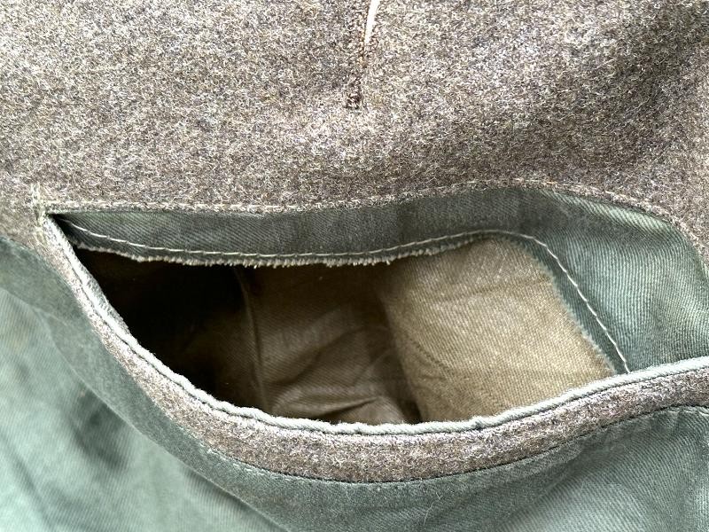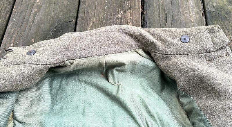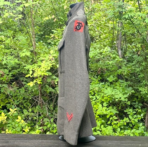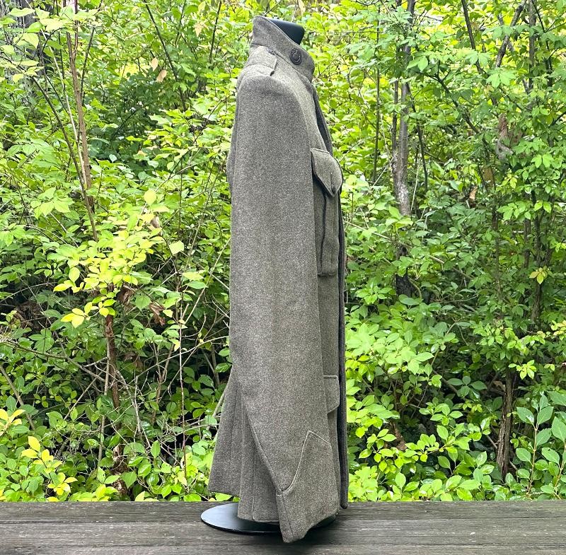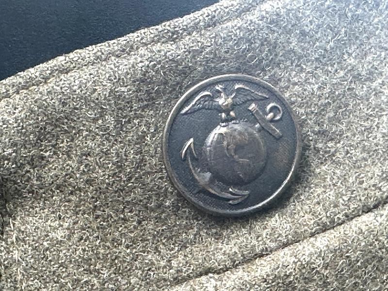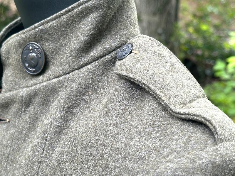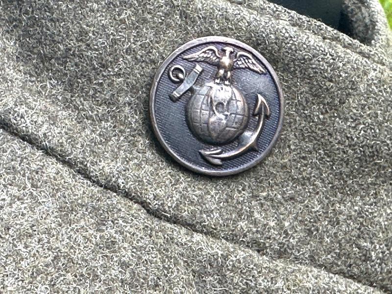 This is a United States Marine Corps Pattern 1917 winter tunic from World War I. This forest green, wool, 5 button tunic is in fantastic condition! All stitching is tight and unbroken. There is minimal moth damage and no stains, rips or tears on the tunic. The original WWI Marine Corps eagle and anchor buttons are found on the front of the tunic. The four pockets, as well as the shoulder epaulettes, have the smaller eagle and anchor buttons. There are two Marine Corps collar disks, both authorized for wear between 1918 and 1919. The epaulettes have the crossed stitching at the shoulder seam, identifying this tunic as being an enlisted mans uniform. The lining of the body is polished cotton material green in color, while the sleeve linings are an olive drab color. The left sleeve lining does not have a Quartermaster's Department stamp. There is no name ink stamped or hand written in the right sleeve lining. The left sleeve has an 11th Marine Regiment, 5th Marine Expeditionary Brigade patch sewn on at the shoulder seam. This beautiful patch, square to represent the 11th Marine Regiment, has a red background with a black Eagle, Globe and Anchor centered on the background. A white Roman numeral V is centered on the globe. In addition to the unit patch, two bullion overseas stripes on a red felt backing are also sewn on the left sleeve. The two overseas stripes indicate 12 months of overseas service. There is no rank sewn on the right sleeve, indicating this Marine was a Private. The 11th Marine Regiment started out as an artillery unit, but was trained as an infantry unit at Quantico during the summer of 1918. On 5 September, 1918 the 11th Marine Regiment was officially designated as an infantry unit. The 11th joined the 13th Marine Infantry Regiment and 5th Machine Gun Battalion to form the 5th Marine Expeditionary Brigade. The 11th Marines shipped out of Philadelphia in two sections, with the regimental headquarters and 1st battalion departing on 29 September and arriving in Brest, France on 13 October. The second section, consisting of the 2nd and 3rd battalions of the regiment, did not depart Hoboken, New Jersey until 14 October and arriving at Brest on 25 October. The 11th Regiment assembled at Tours, France just nine days before the armistice was signed. No units of the 5th Marine Brigade saw combat, instead they performed MP and administrative duties until their return to the US on 29 July, 1919. The regiment was deactivated on 11 August, 1919. If you collect WWI uniforms, especially USMC uniforms, this one needs no upgrade!