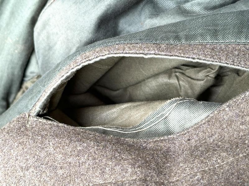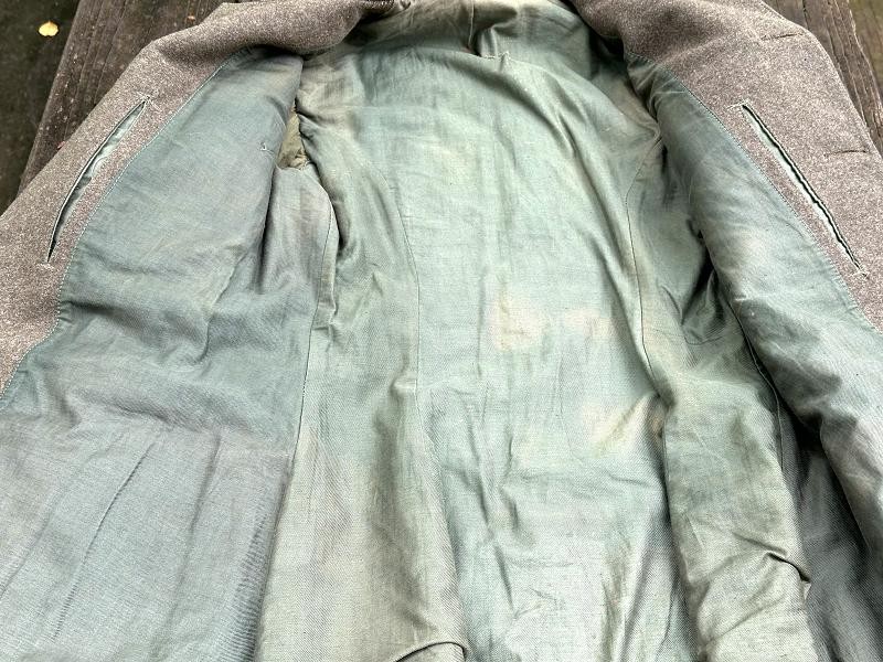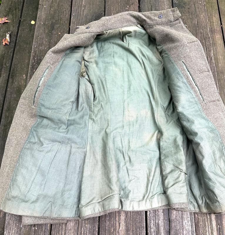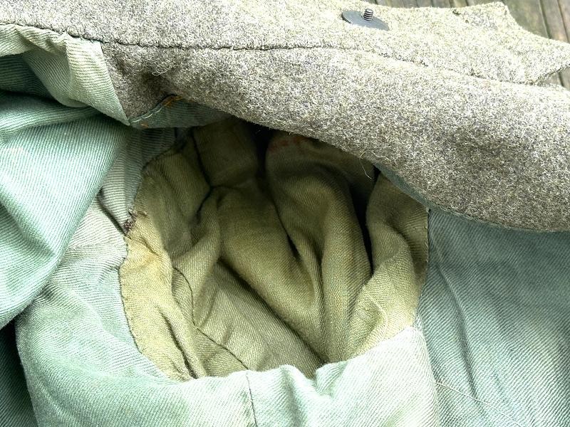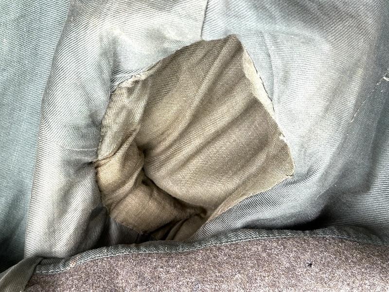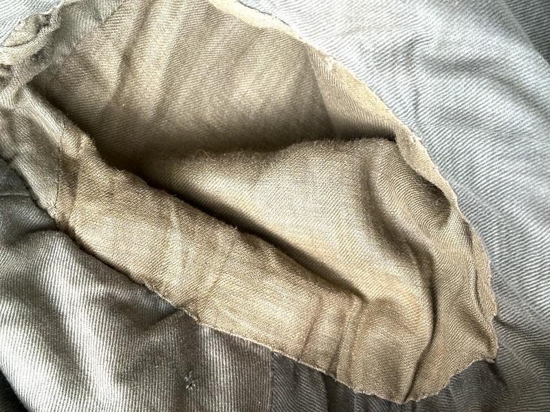 This is a United States Marine Corps Pattern 1917 winter tunic from World War I. This forest green, wool, 5 button tunic is in fantastic condition! All stitching is tight and unbroken. There is minimal moth damage and no stains, rips or tears on the tunic. The original WWI Marine Corps eagle and anchor buttons are found on the front of the tunic. The four pockets, as well as the shoulder epaulettes, have the smaller eagle and anchor buttons. There are two Marine Corps collar disks, both authorized for wear between 1918 and 1919. The epaulettes have the crossed stitching at the shoulder seam, identifying this tunic as being an enlisted mans uniform. The lining of the body is polished cotton material green in color, while the sleeve linings are an olive drab color. The left sleeve lining does not have a Quartermaster's Department stamp. There is no name ink stamped or hand written in the right sleeve lining. The left sleeve has an 11th Marine Regiment, 5th Marine Expeditionary Brigade patch sewn on at the shoulder seam. This beautiful patch, square to represent the 11th Marine Regiment, has a red background with a black Eagle, Globe and Anchor centered on the background. A white Roman numeral V is centered on the globe. In addition to the unit patch, two bullion overseas stripes on a red felt backing are also sewn on the left sleeve. The two overseas stripes indicate 12 months of overseas service. There is no rank sewn on the right sleeve, indicating this Marine was a Private. The 11th Marine Regiment started out as an artillery unit, but was trained as an infantry unit at Quantico during the summer of 1918. On 5 September, 1918 the 11th Marine Regiment was officially designated as an infantry unit. The 11th joined the 13th Marine Infantry Regiment and 5th Machine Gun Battalion to form the 5th Marine Expeditionary Brigade. The 11th Marines shipped out of Philadelphia in two sections, with the regimental headquarters and 1st battalion departing on 29 September and arriving in Brest, France on 13 October. The second section, consisting of the 2nd and 3rd battalions of the regiment, did not depart Hoboken, New Jersey until 14 October and arriving at Brest on 25 October. The 11th Regiment assembled at Tours, France just nine days before the armistice was signed. No units of the 5th Marine Brigade saw combat, instead they performed MP and administrative duties until their return to the US on 29 July, 1919. The regiment was deactivated on 11 August, 1919. If you collect WWI uniforms, especially USMC uniforms, this one needs no upgrade!