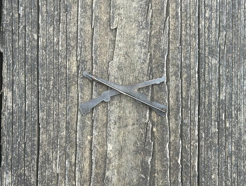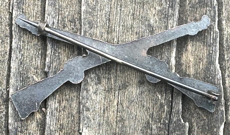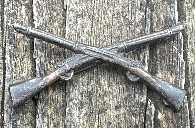 This is a US Infantry officer collar insignia from the WWI era. US Officers began wearing branch insignia on their collar, and in 1902 Army regulations authorized the wear of crossed rifles for the Infantry branch. In 1905 the insignia was changed from the 1795 musket to the 1903 Springfield rifle. This bronze insignia measures 2" wide and 1" high. It retains much of the original finish. The pin and simple "C" catch and both present. If you have a WWI officer's uniform and it's missing an Infantry branch insignia, here you go!
