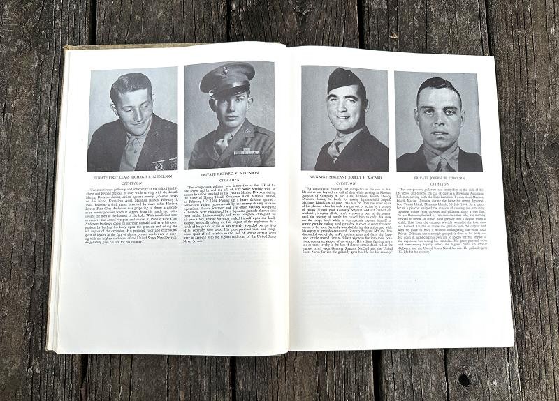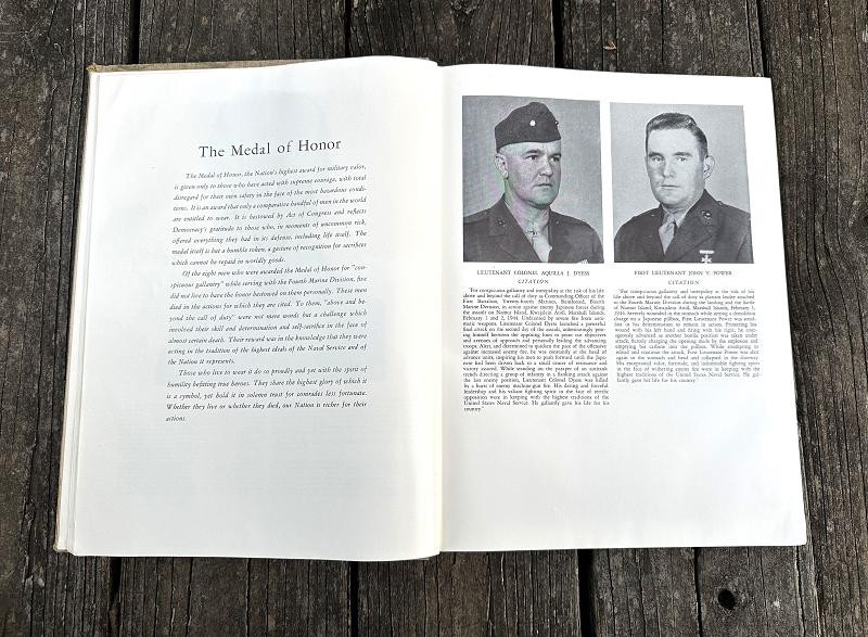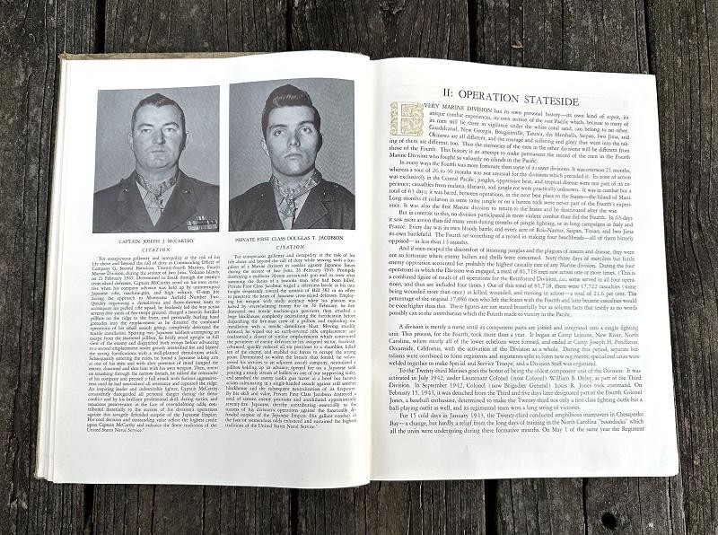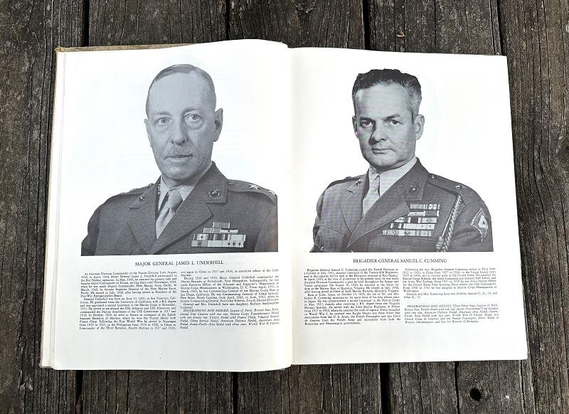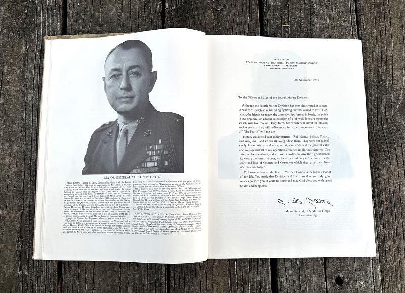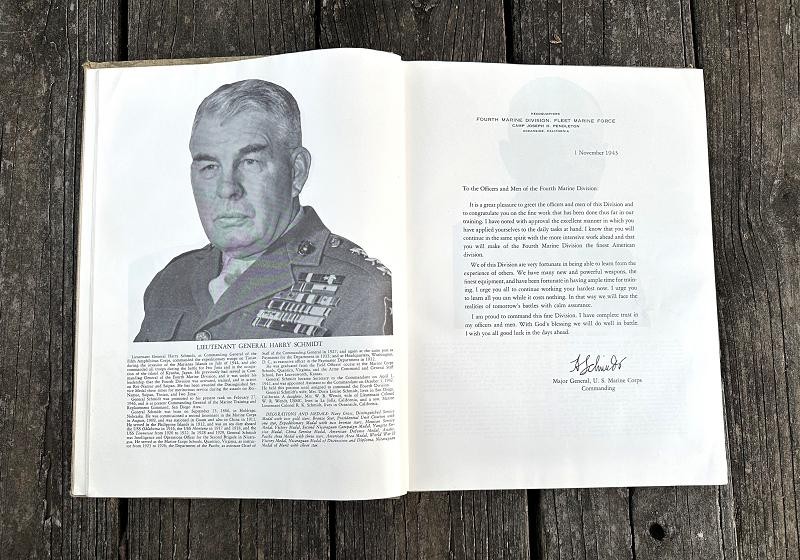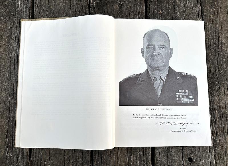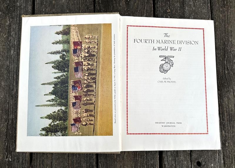 This book was edited by Captain Carl W. Proehl and published in December 1946. The narrative is 216 pages, is illustrated with color and black and white photos, a list of Marine and Navy personnel killed in action or died of wounds by campaign and seven appendixes. This book is a first edition that was published by the Infantry Journal Press. It captures the resilience, bravery and triumphs of the Marines in the Pacific theater through vivid narratives and detailed accounts of their experiences. From the island fighting on Roi-Namur, Saipan, Tinian and Iwo Jima Proehl's work brings to life the stories of the Fourth Marine Division and their pivotal role in shaping the course of World War II. This book stands as a lasting testament to their courage and commitment, offering unique insights into one of the most celebrated units in Marine Corps history. This hard back book is in very good condition and does not have a dust cover. This is a must have reference for any Fourth Marine Division collector.