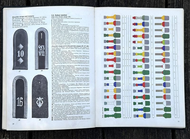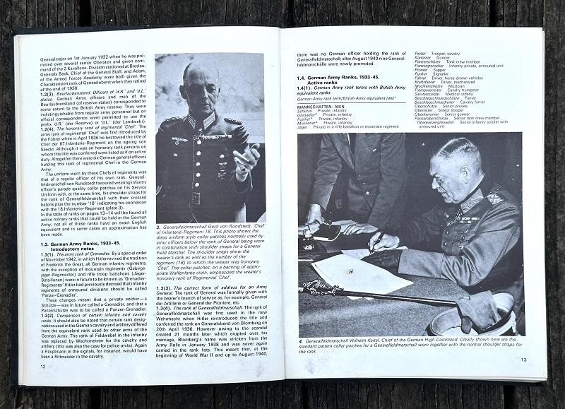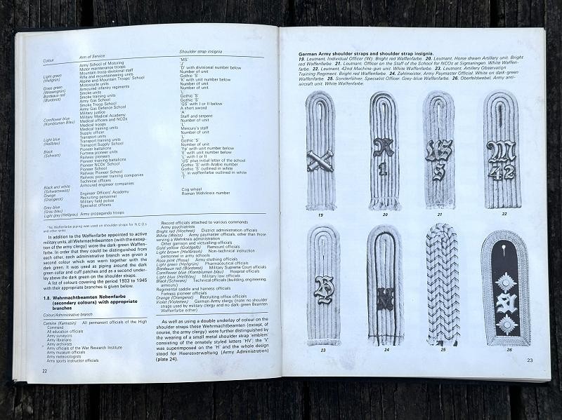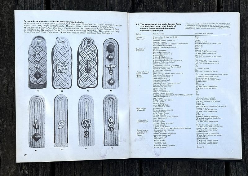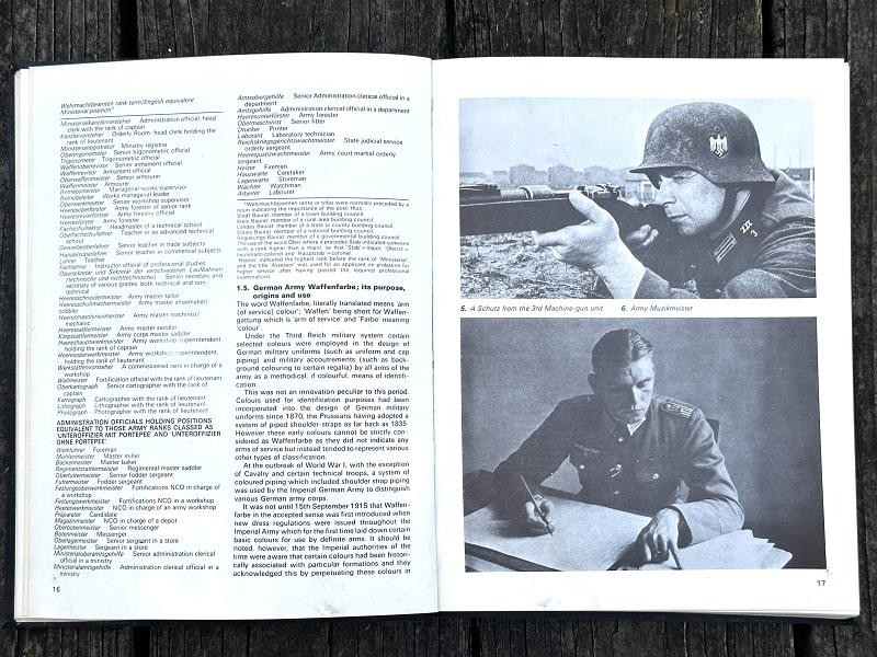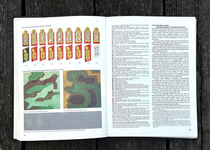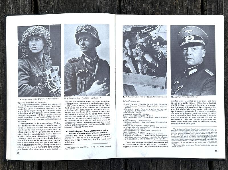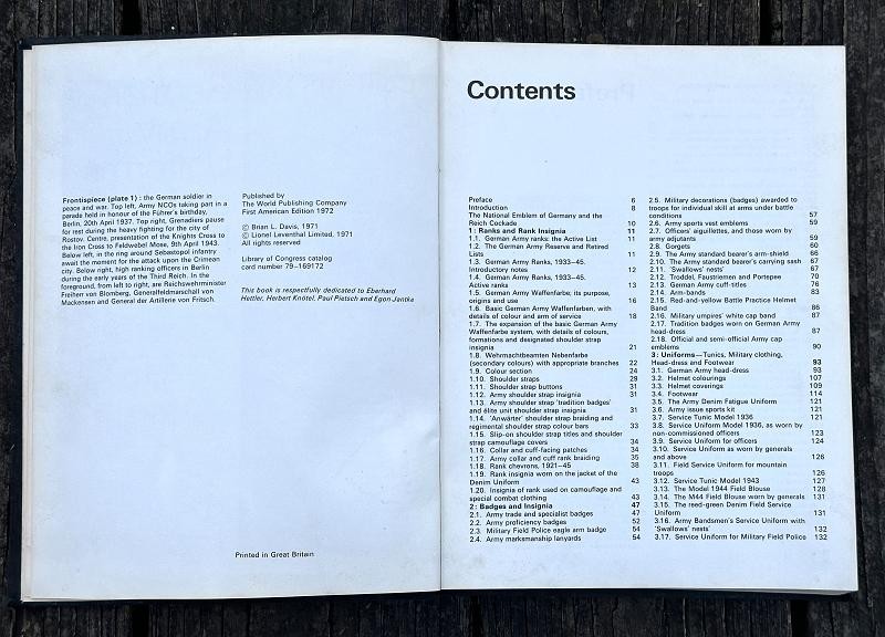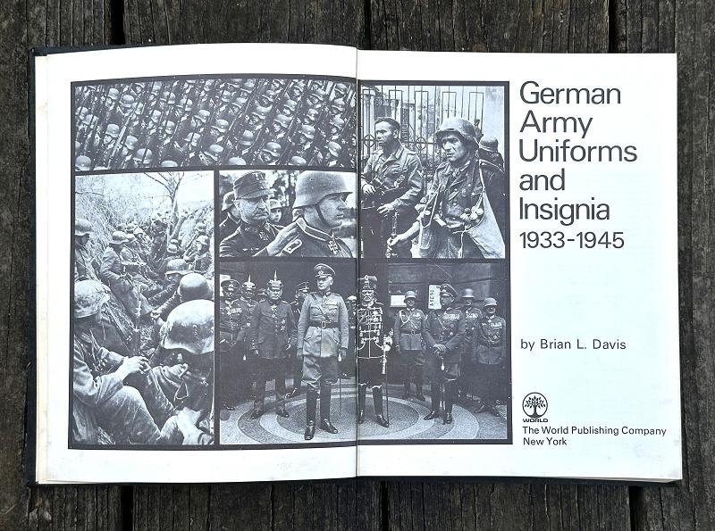 This book was written by Brian L. Davis and originally published in 1971. The narrative is 212 pages, is illustrated with black and white photos and colored plates. This is the first reference book supported by full photographic evidence to cover in detail every aspect of the military uniforms, insignia and accoutrements of the German Army during the time of the Third Reich. This work provides the first serious basis, founded on original research , for the study of an essential aspect of uniform history. The uniforms detailed and illustrated are those of the regular German Army, the Wehrmacht-Heer: the various National Socialist para-military formations and political organizations which were not part of the regular army are not included. Many years of research went into this book. The author had access to official papers, army order and clothing regulations and the result is amazing. This hard back book is in good condition and does not have a dust cover. This is a must have reference for any WWII German uniform collector.