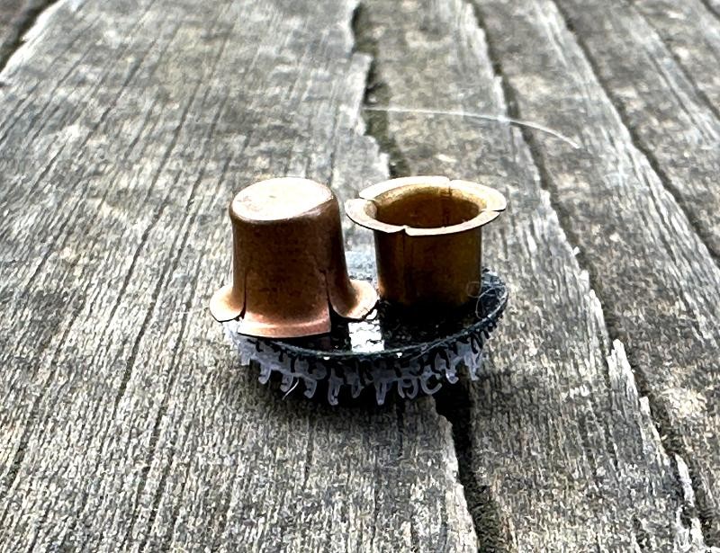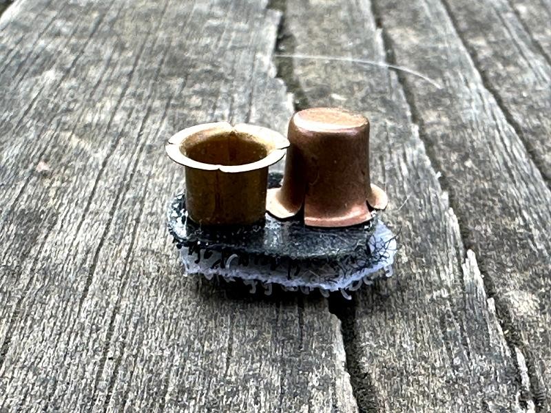 This is a set of loose reproduction Civil War musket caps. These caps were in paper packets that would have been issued with bullets in packages. This set of two are mounted on a tacky base with a velcro bottom to hold them in place in a display case. They are the larger, splayed caps used on muskets and percussion carbines. These can still be used to fire your reproduction civil war era musket or rifled musket. They would really look great displayed with your cartridge box, cap box and musket.